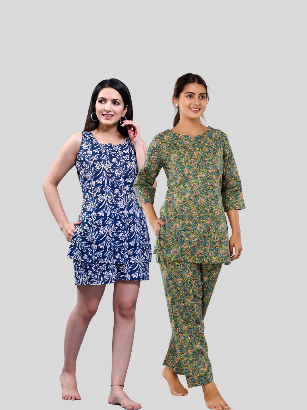 A lounge wear and shorts set includes a comfortable, stylish top paired with matching shorts. The top is typically soft and relaxed, while the shorts feature an elastic waistband for a snug yet flexible fit. Perfect for lounging at home or casual outings, this set combines ease with modern style.