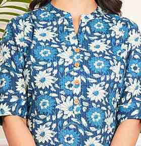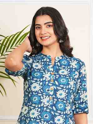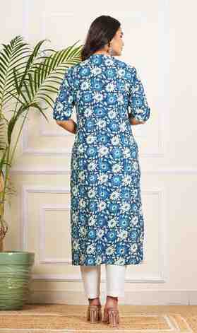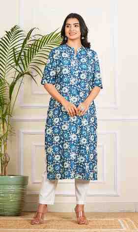 Step into a serene garden of style with the Neel Baag Kurti. Featuring a deep blue base blossoming with delicate floral prints, this straight-cut cotton kurti captures the essence of timeless grace. With its comfortable fit, button-down detailing, and band collar, it's a beautiful blend of nature’s calm and everyday sophistication.