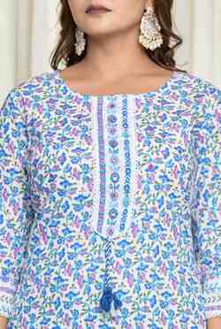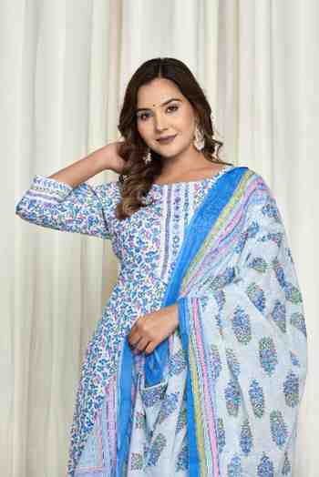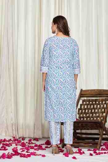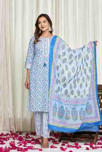 Step into elegance with the Neel Kamal set, a serene blend of soft blue floral handblocked prints on pure cotton. This comfortable straight kurta paired with a matching pant and dupatta brings a breezy, refreshing vibe — perfect for festive mornings or casual gatherings. The charming motifs and soothing palette make it a timeless pick for your ethnic wardrobe.