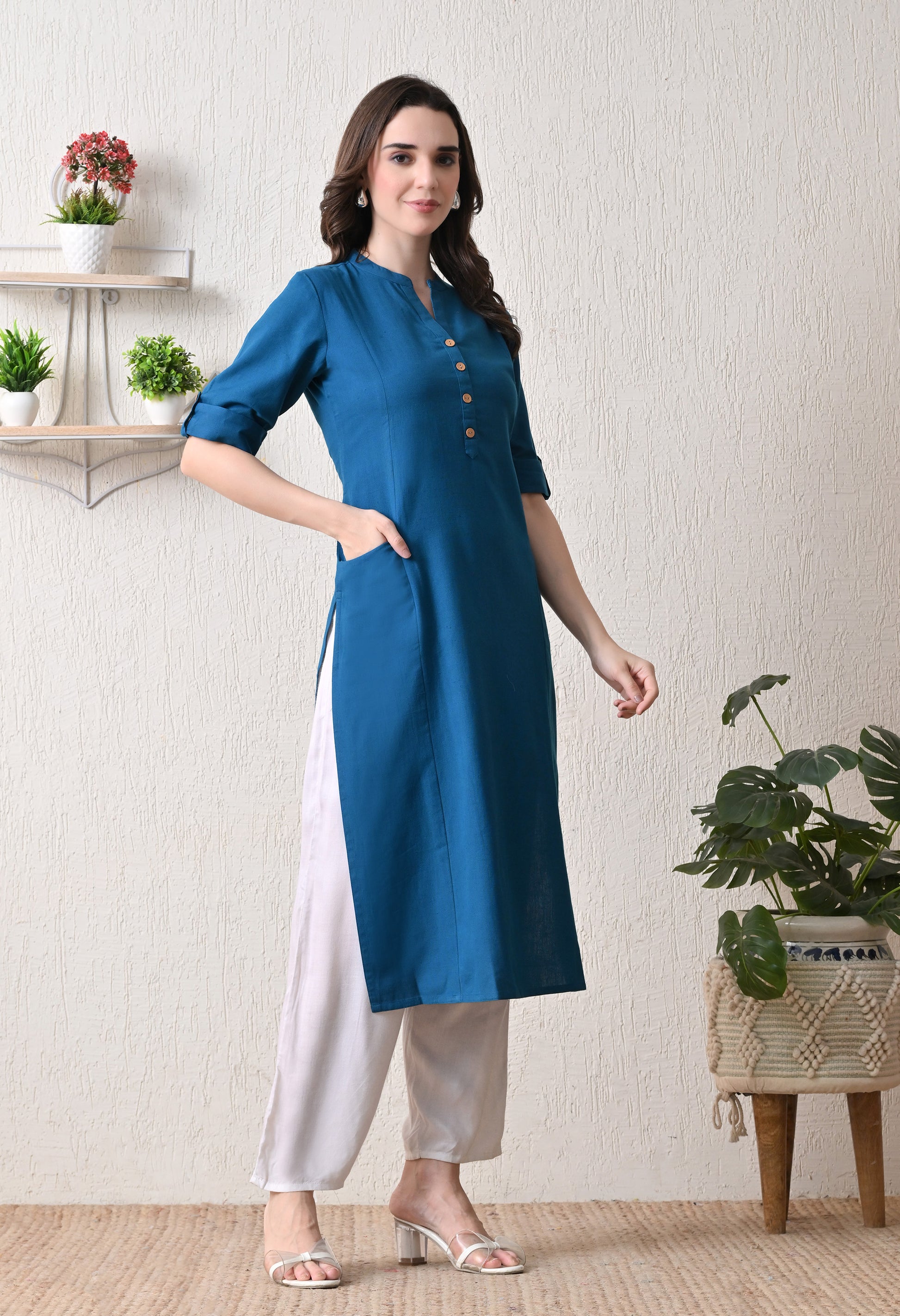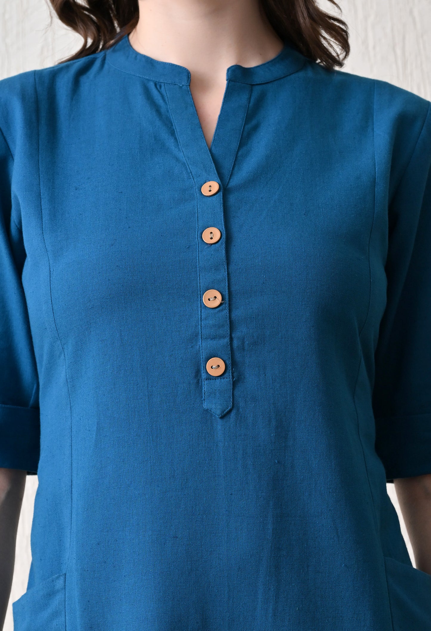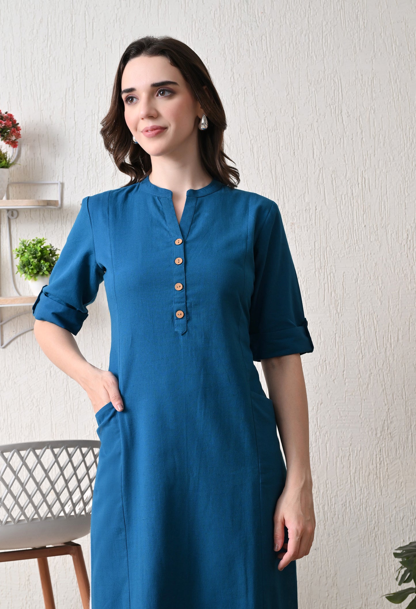 Shine in everyday simplicity with the Neel Tara Kurti. Designed in a rich deep blue hue, this straight-cut cotton kurti features a mandarin-style neckline, wooden buttons, and roll-up sleeves for a relaxed yet polished vibe. Inspired by the calmness of twilight skies, it’s perfect for office days, casual outings, or festive minimalism.