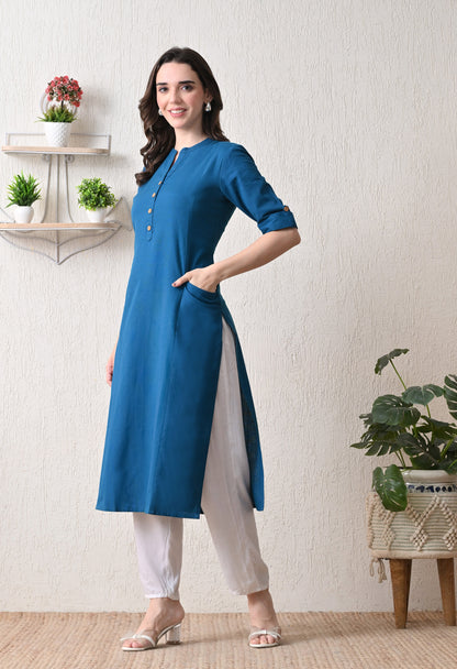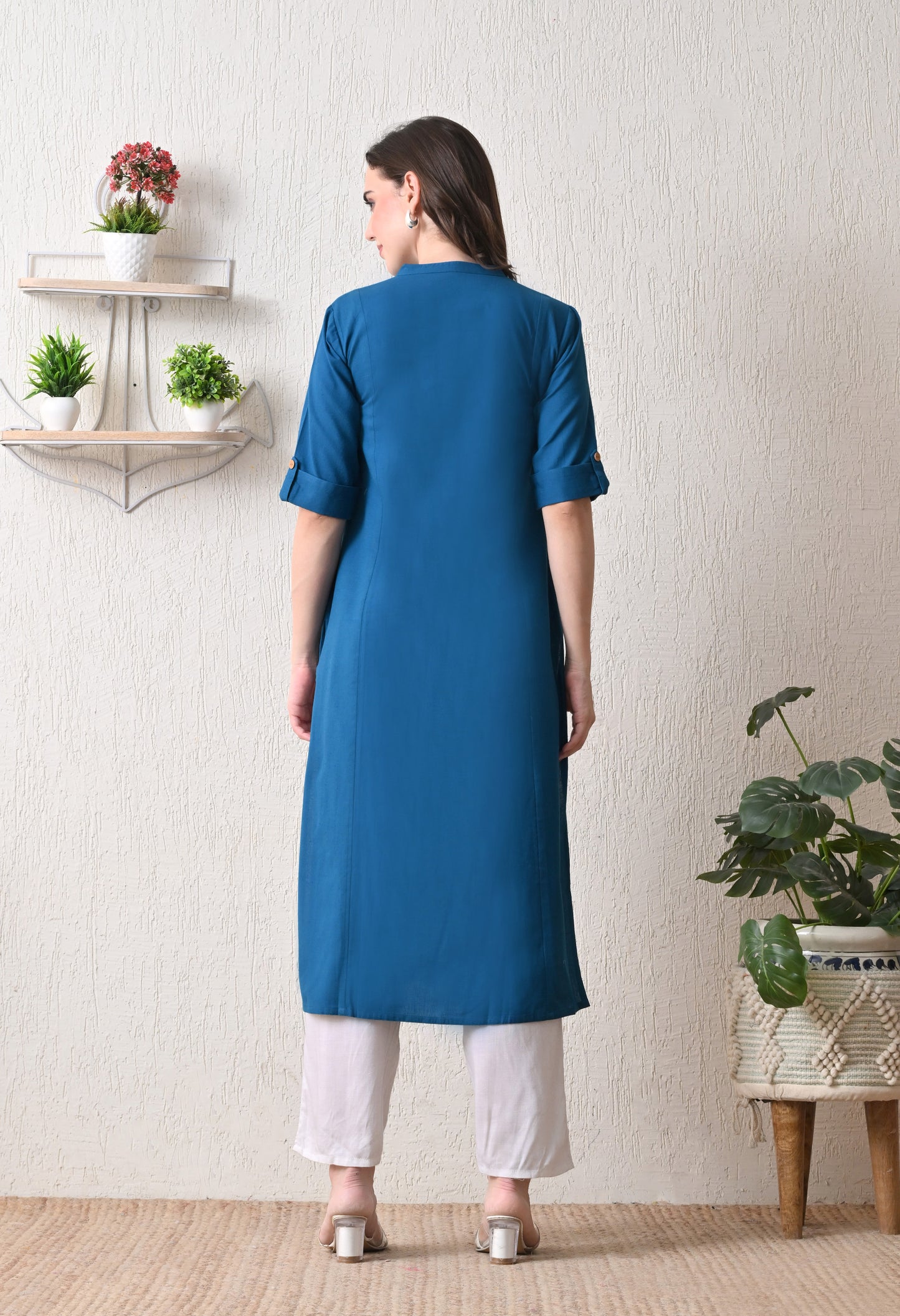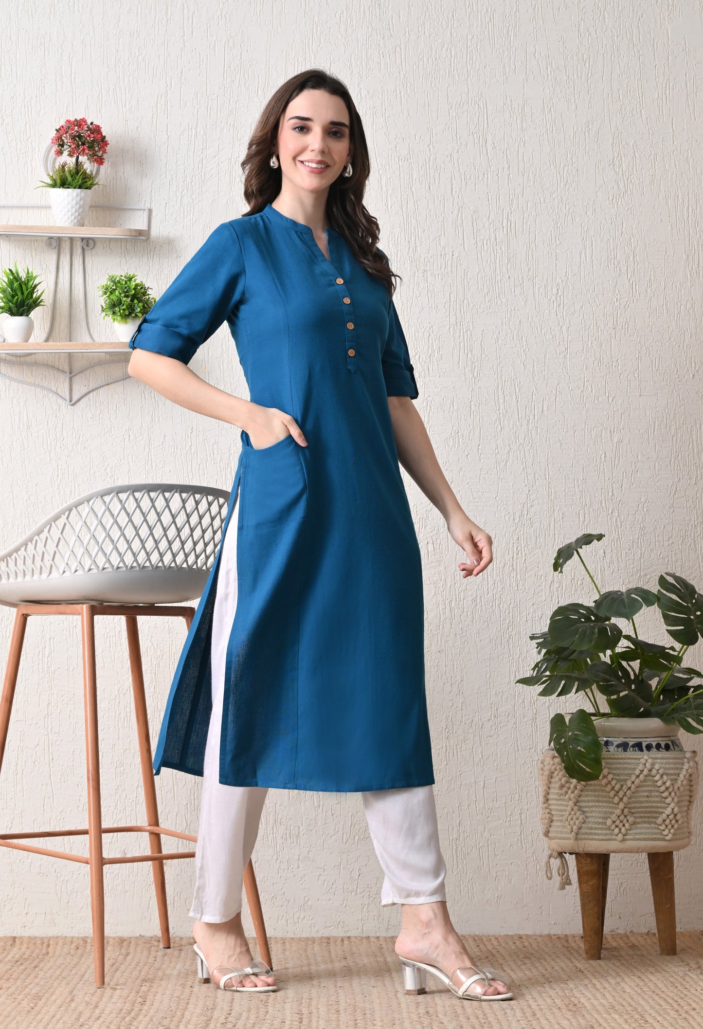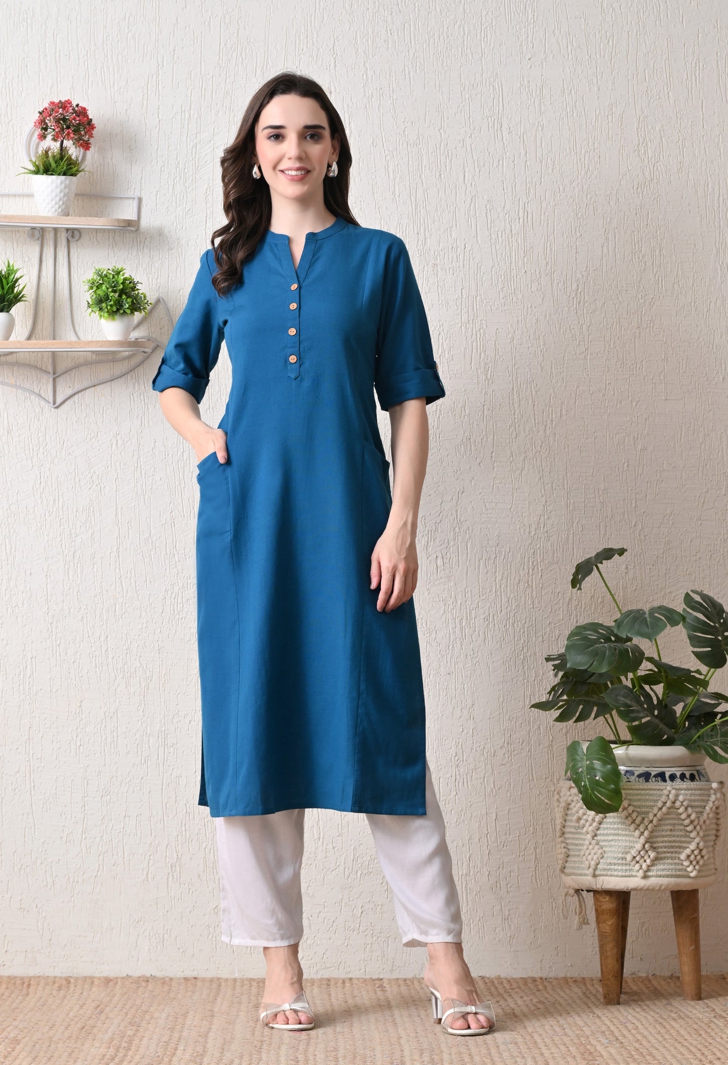 Shine in everyday simplicity with the Neel Tara Kurti. Designed in a rich deep blue hue, this straight-cut cotton kurti features a mandarin-style neckline, wooden buttons, and roll-up sleeves for a relaxed yet polished vibe. Inspired by the calmness of twilight skies, it’s perfect for office days, casual outings, or festive minimalism.