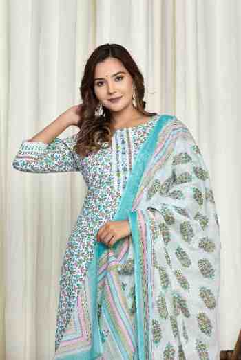 Radiate effortless charm with the Sitara Bloom set a soft cotton ensemble adorned with delicate floral handprints in calming shades of turquoise and white. The straight-cut kurti and matching pant offer breezy comfort, while the beautifully bordered dupatta adds a touch of festive flair. Whether it’s a Rakhi celebration or a sunny day out, this set blends grace and comfort perfectly.